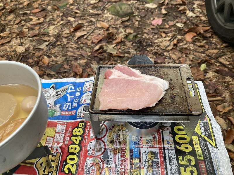 固形燃料で鉄板をあぶり、焼肉開始でぇ〜す