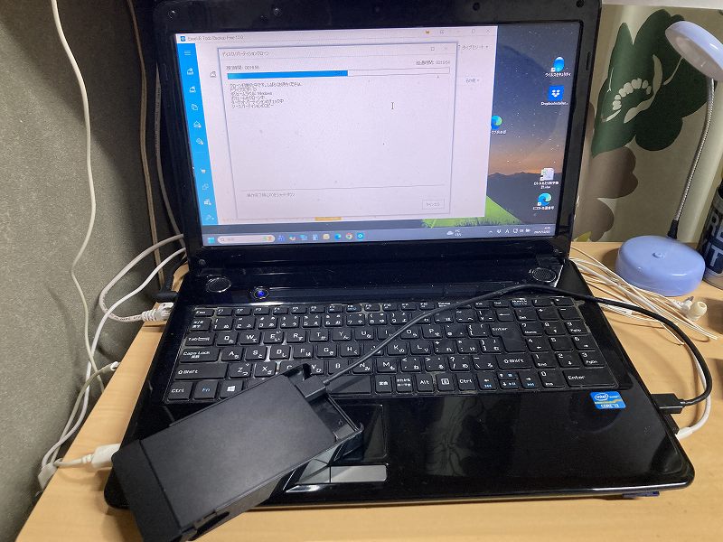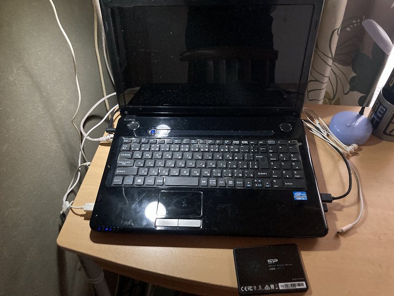 SSDが悪くて、バックアップ用SSDで動かしているノートパソコン